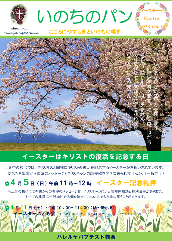 教会の前にはぶどう園が広がっており、その向こうには富士山を望むことができます。ぶどうの房が樹につながっていてはじめて実を結ぶように人生において本当に価値のある実を結ぶ秘訣はイエス様との個人的な関わりにあります。